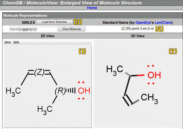 - 2D View and Sketcher: 2D view of the molecule, including absolute labels for all stereocenters. Click on the viewer applet to bring up a sketcher window to manipulate and modify the molecule.