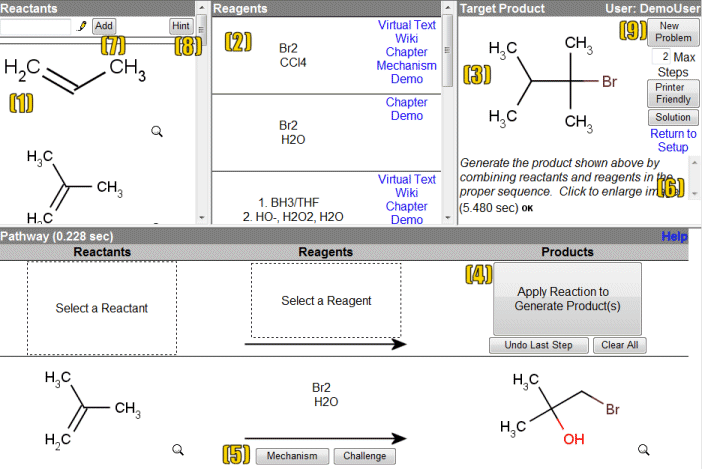 - When generating reaction products, the system will often omit "inherent products" in the results for the sake of brevity. For example, bromine radical addition should yield HBr as a by product and condensation reactions should yield H2O in the products, but the system does not display these. For "real" examination purposes, you should include all of these to properly balance all reaction equations.